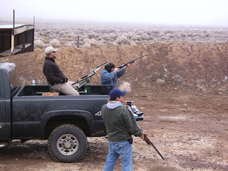 Our good friend was manning the flinger in this picture, my son Kevin is on the other side of the truck and Derek is closest to me. After we shoot heads up for awhile, we will start shooting doubles, sometimes heads up, sometimes one at a time. And later still we will challenge Kevin to shoot 4 targets out of the air with his pump. Yes, I've seen him do it! One of my nick names for him is 'dead-eye Dick' he has awesome hand eye coordination!